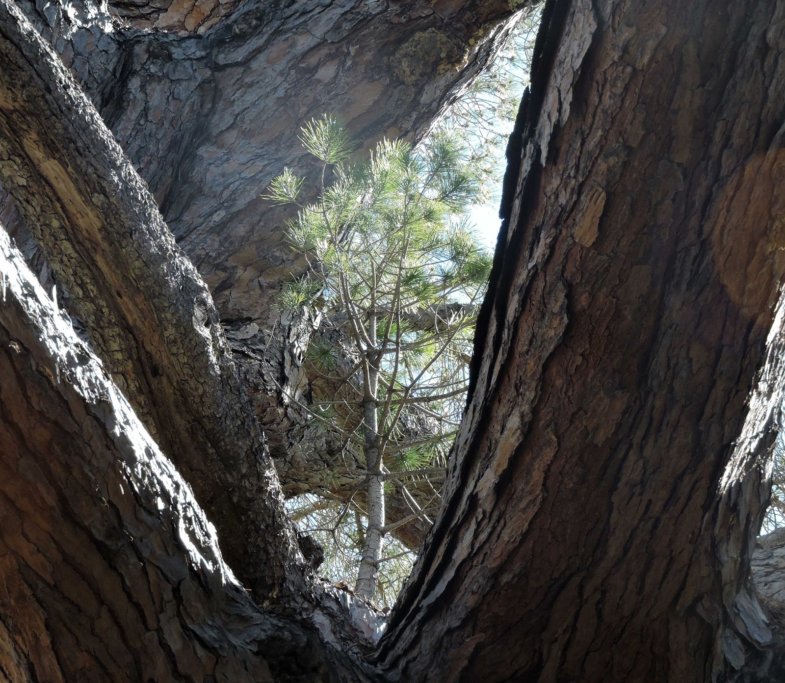 A més a més amb curiositats, perquè a la seva capçada hi neix un altre pi molt més petit. Si us el mireu bé, veureu que el pi gran és un pi pinyer, Pinus pinea, mentre que el pi petit que hi neix dins és un pi blanc, Pinus halepensis.
